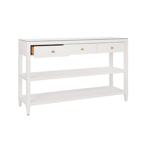 For any questions please call 800-970-5889. Worlds Away - Briar Three Drawer Console With Two Open Shelves in White Textured - BRIAR WH Features: ...