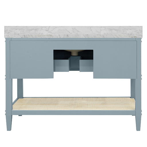 For any questions please call 800-970-5889. Worlds Away - Kealy Bath Vanity With Scallop Detail In Matte Light Blue With White Marble Top And Porce...