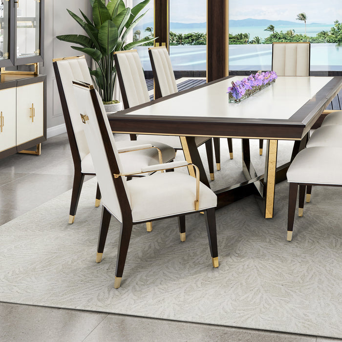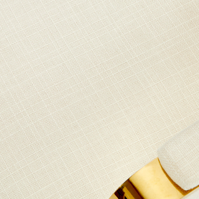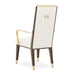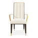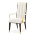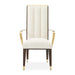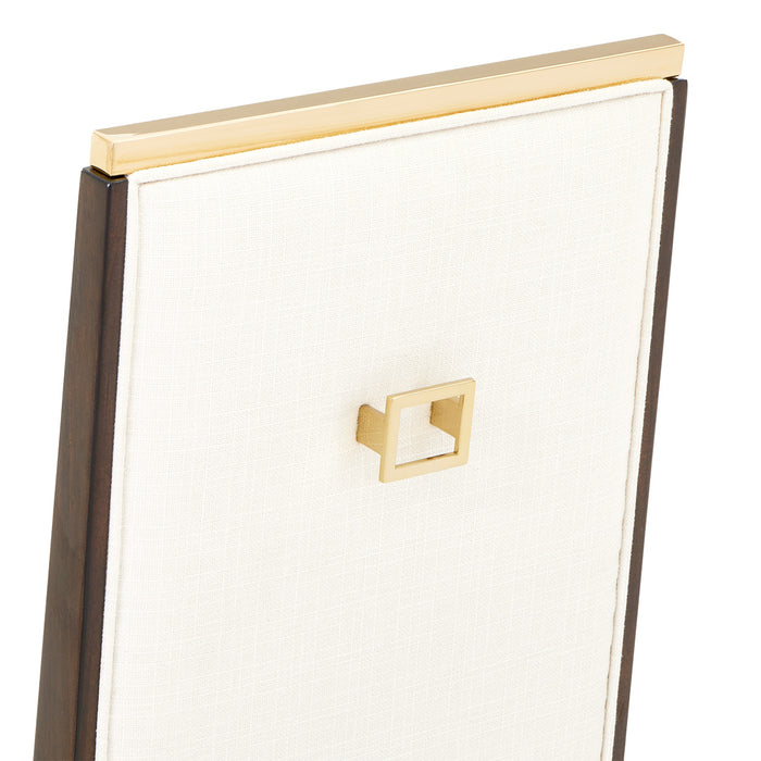 Experience a fusion of comfort and opulence with the Belmont Place Side Chair. The channeled cream fabric, echoing timeless elegance, promises a seating experience like no other. Accentu- ated by the sheen of Japan gold plated alloys, and the unique geometric accent on its back, this chair transforms every dining moment into an occasion worth remembering.