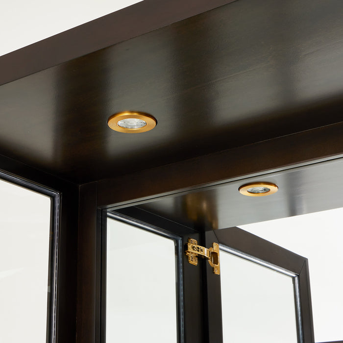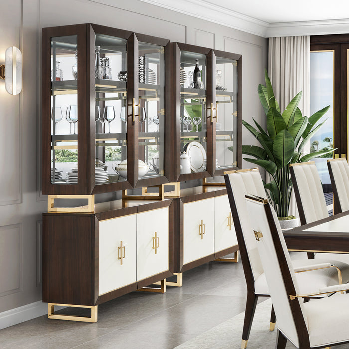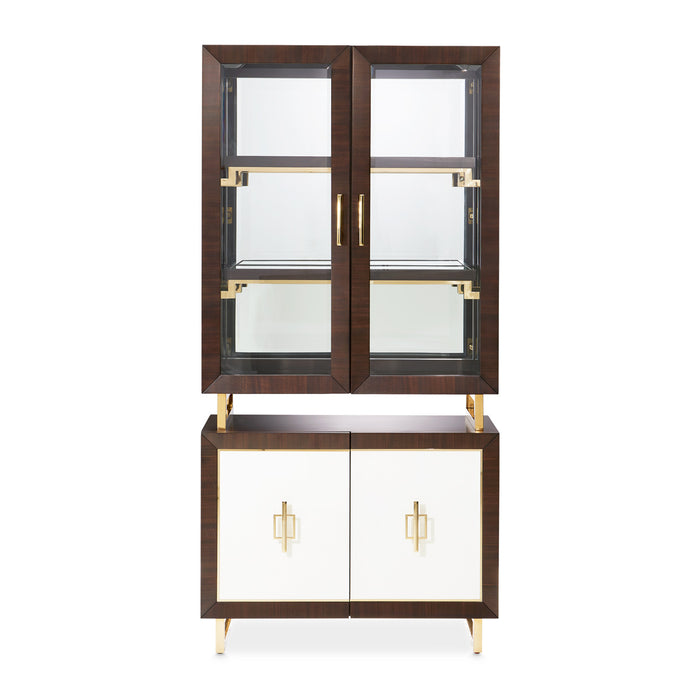 Showcase your cherished possessions with the Belmont Place Display Cabinet. From its base with discreetly adjustable wood shelving, to its top featuring glass shelves framed in gold accents. Every detail nods to unparalleled artistry. This piece is a testament to the beauty born from meticulous design and craftsmanship.