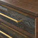 This nightstand is crafted from Walnut solids and veneer with sandblasted Douglas Fir drawer fronts. The sandblasting raises the grain on the drawers creating a textural contrast to the Walnut case. Three drawers are finished with satin brass