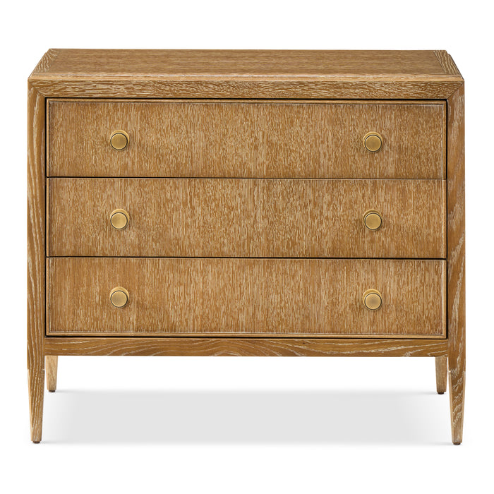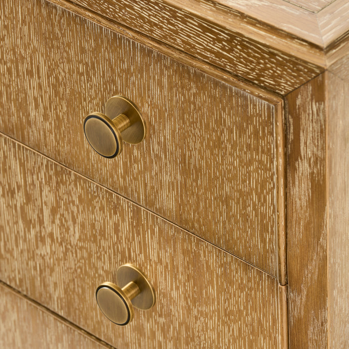 This three drawer nightstand is crafted from Oak solids and veneers. Shown in Oak ceruse finish.