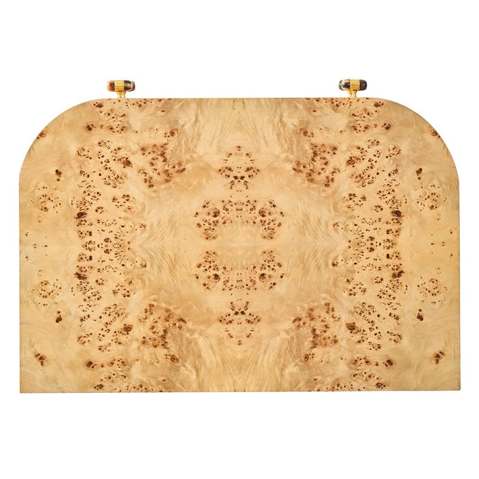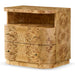 This bowfront nightstand features two drawers with an open top shelf. Veneered in Mapa Burl, the case is finished in a clear coat to enhance the beauty of the wood. Four bullet shaped brass and wood pulls complete the look.