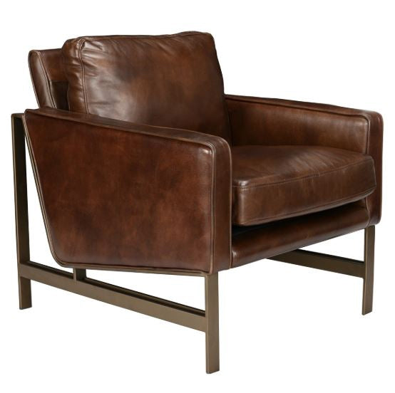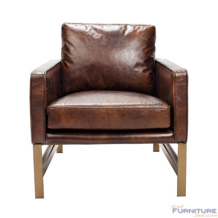 The Chazzie Club Chair is upholstered in top grain leather to provide a plush and premium material to this understated seating option. Its iron base is treated with a brass finish that complements the leather and creates a luxe feel. Elegant forms and classic materials combine to make the Chazzie Club Chair a stunning piece for any space.