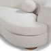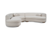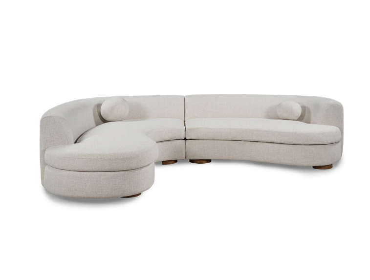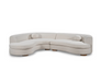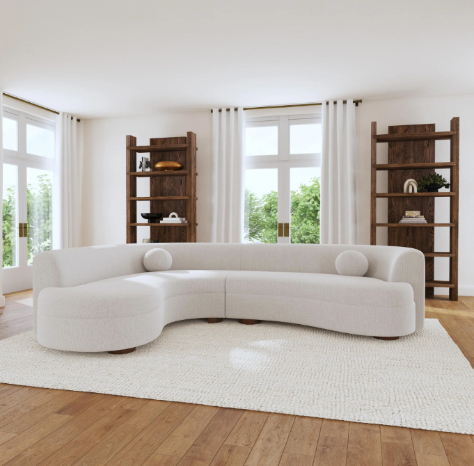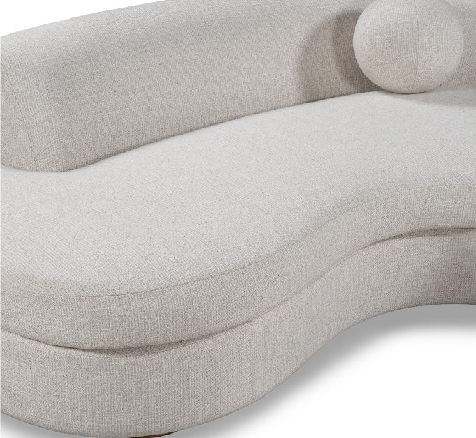 This curved sectional combines modern elegance with cozy comfort. Upholstered in soft, textured bouclé fabric, it features gently rounded edges that create a welcoming silhouette. Its seamless, flowing design adds a touch of sophistication to any space, while plush cushions and matching round accent pillows enhance relaxation. Perfect for conversation or lounging, this sectional blends style and function, making it an inviting centerpiece for any living room.