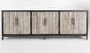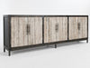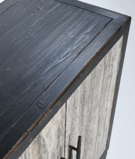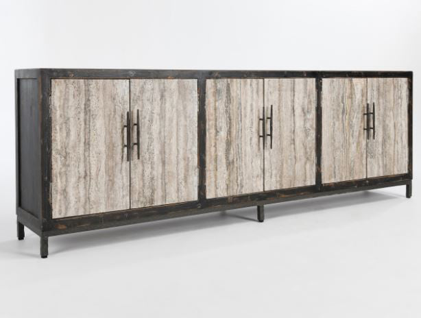 Smooth granite doors contrast against the reclaimed pine wood frame of this handsome sideboard.