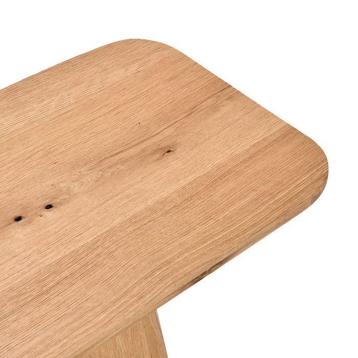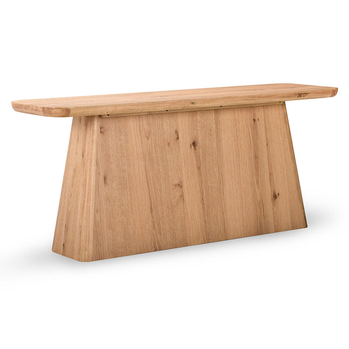 With beveled corners and an angled pedestal base, the Orlando Console Table in natural amplifies its oak aesthetic through modern design.