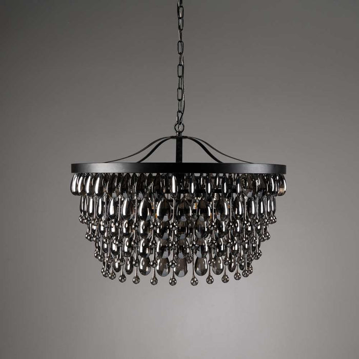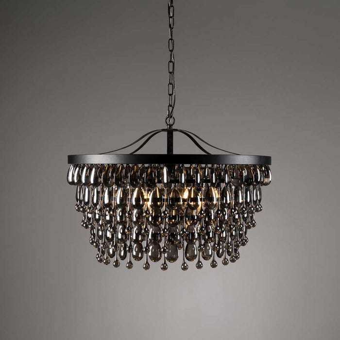Glass droplets create brilliant shine in this vintage-style chandelier featuring seven bulbs within an iron frame.