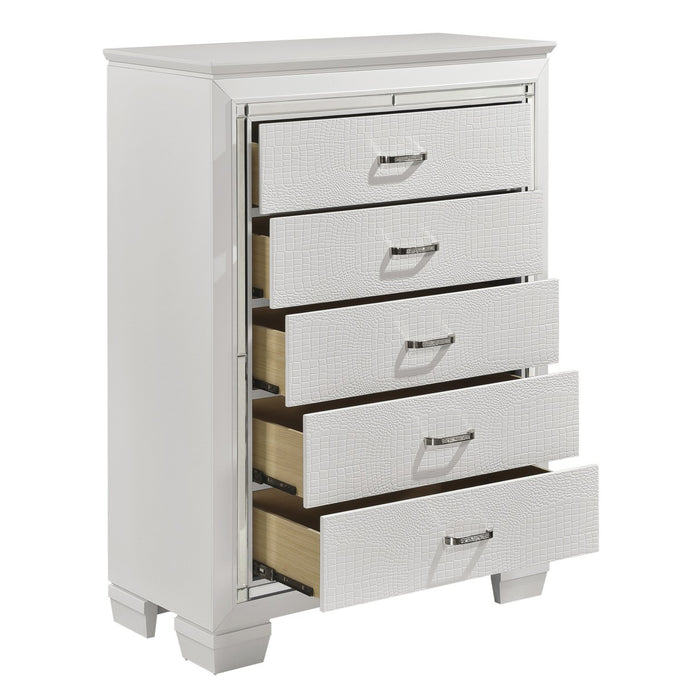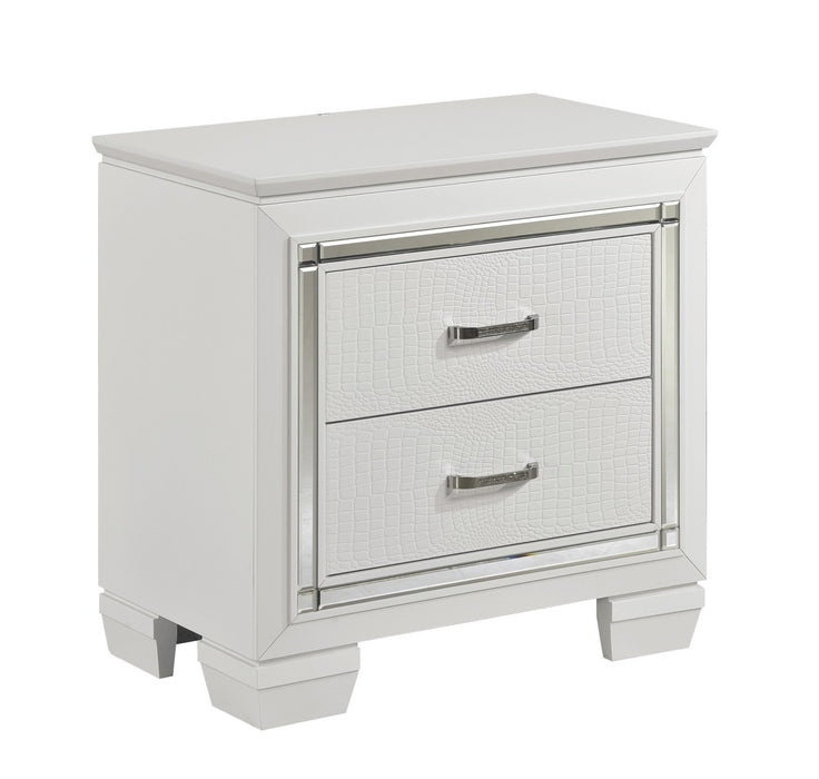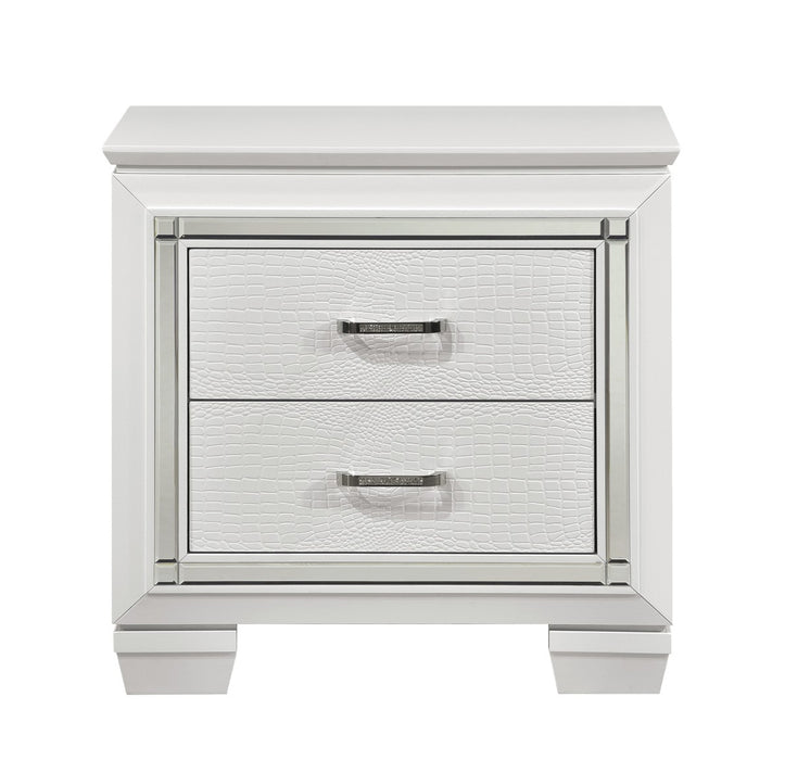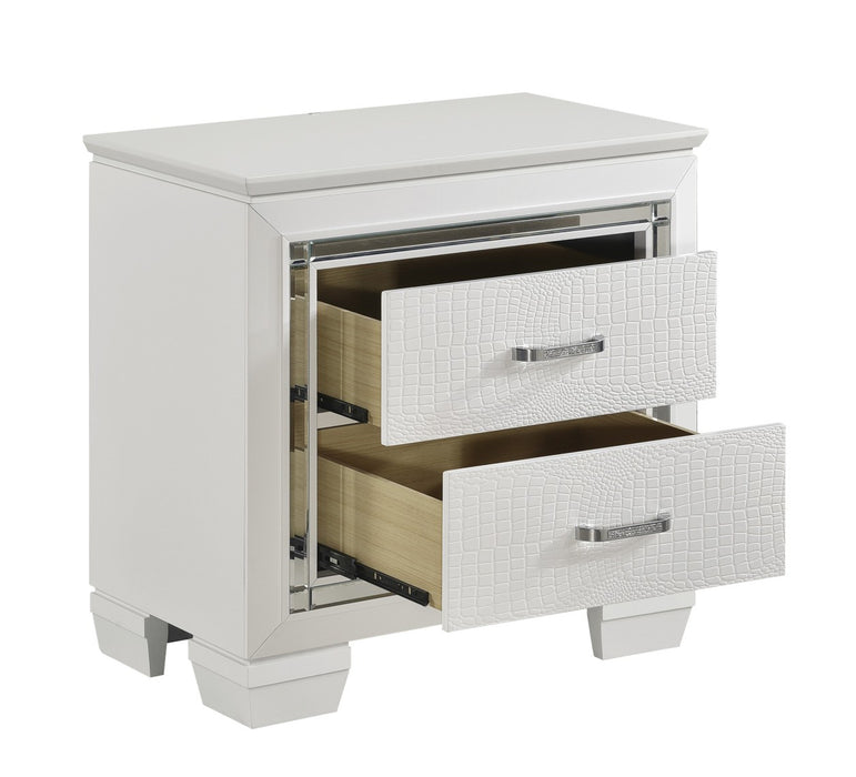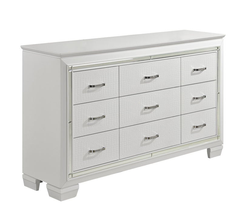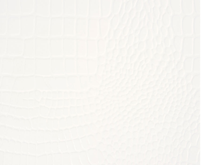 Glamour reigns in the design of the Allura Collection. Framing the Full bed is a decorative beveled mirror accent that enhances the illumination from the touch-engaged LED backlight of the headboard. Alligator embossing and high polished crystal-enhanced hardware boldly accent the white finish as does the pearl-white faux leather crystal-tufted headboard insert.