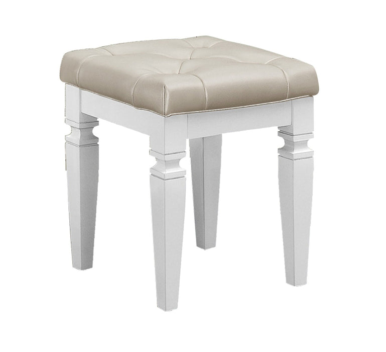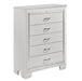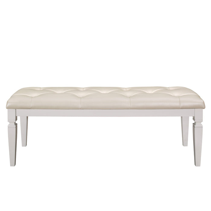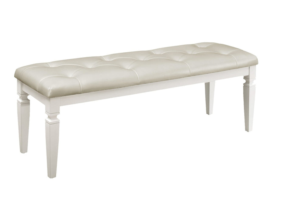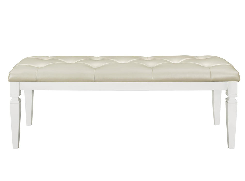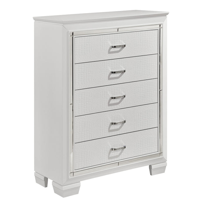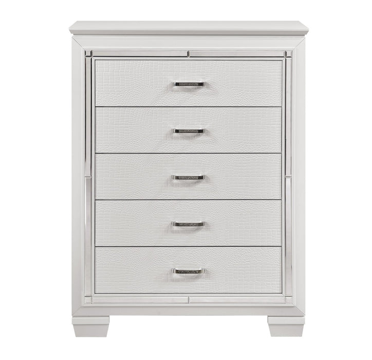 Glamour reigns in the design of the Allura Collection. Framing the Full bed is a decorative beveled mirror accent that enhances the illumination from the touch-engaged LED backlight of the headboard. Alligator embossing and high polished crystal-enhanced hardware boldly accent the white finish as does the pearl-white faux leather crystal-tufted headboard insert.
