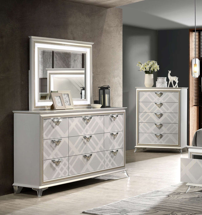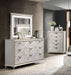The Bucharest Bedroom Set by J&M Furniture combines contemporary elegance with practical design. The bed is upholstered in soft boucle fabric, offering a unique textured look and luxurious comfort. An integrated LED light kit adds a modern touch, creating a warm and inviting ambiance that enhances the bedroom's atmosphere.Completing the set, the matching mirror features a built-in light, providing both functionality and style. With its premium materials, sleek design, and thoughtful details, the Bucharest Bedroom Set is the perfect choice for transforming your bedroom into a stylish and serene retreat. **A box spring or bunky board is required for this bed.