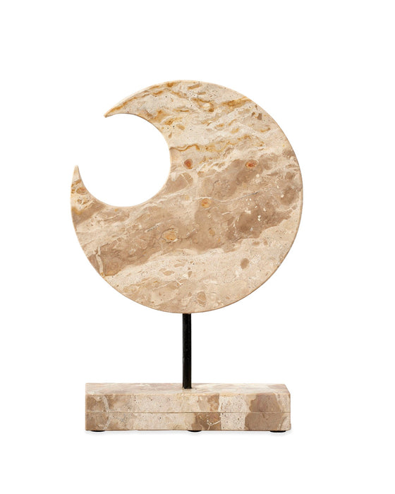 This dramatic sculpture uses cream colored marble to reflect and respect the beauty of celestial objects. The intrinsic veining and shading of the natural stone nods to the rocky formations of our constant companions in the sky. They are sized to make a strong visual impact, and are a wonderful way to add height to any tabletop display. No two will be identical.