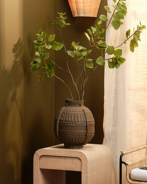 Warm afternoons spent admiring the Greek and Roman antiquities of European museum collections provided the inspiration for this vase. Our version has been masterfully crafted of rich, earth-toned porcelain clay by modern artisans. It can hold water and can be used alone or to display anything from roses to reeds.