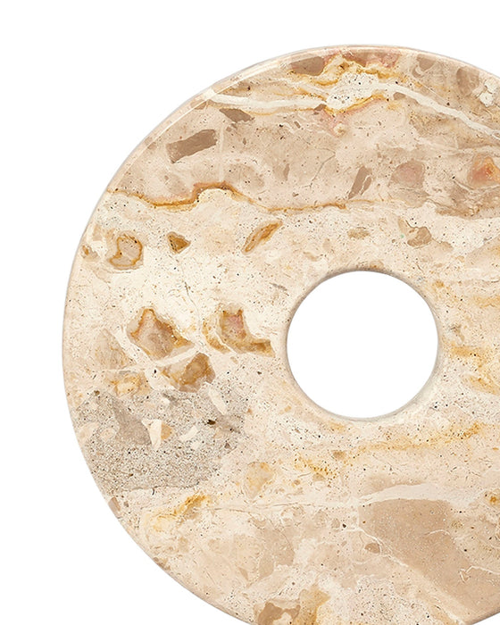 This dramatic sculpture uses cream colored marble to reflect and respect the beauty of celestial objects. The intrinsic veining and shading of the natural stone nods to the rocky formations of our constant companions in the sky. They are sized to make a strong visual impact, and are a wonderful way to add height to any tabletop display. No two will be identical.