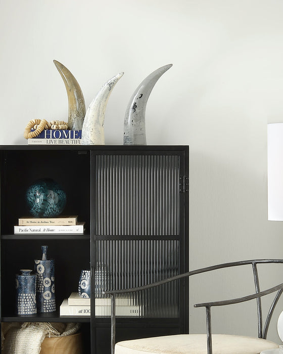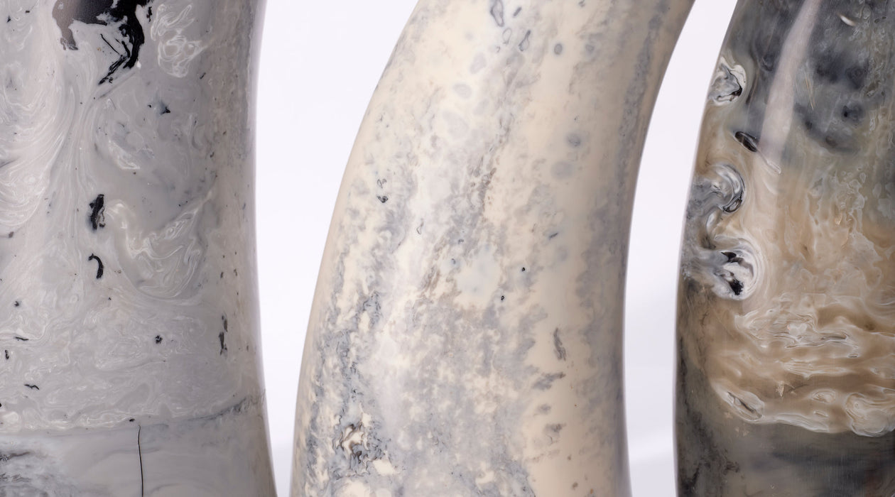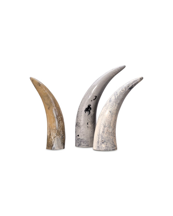A dramatic reinterpretation of natural horn décor, our trio of sculptural accents is formed of swirled resin in cream, black, and gray. Each piece our artisans craft is one of a kind, as no two sets of patterns created using this technique are ever identical. Display on a bookshelf, console, or coffee table for the vertical accent that your décor is missing.