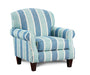 'The Life's a Beach Oceanside Accent Chair is a beautiful accent chair that features rolled arms, a tight back, a loose seat cushion with box border welt, chunky tapered legs in a coffee finish and a fun striped fabric. The Life's a Beach Oceanside occasional chair is a beautiful accent to our Grande Glacier Sofa Collection or will work well as a stand alone accent chair. The material is 100% Polyester making it not only beautiful but also soft, durable and cleanable. Due to lighting and monitor differences, actual colors and finishes may vary slightly from what appears online