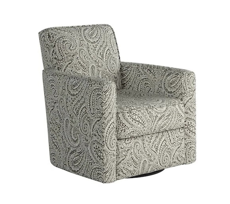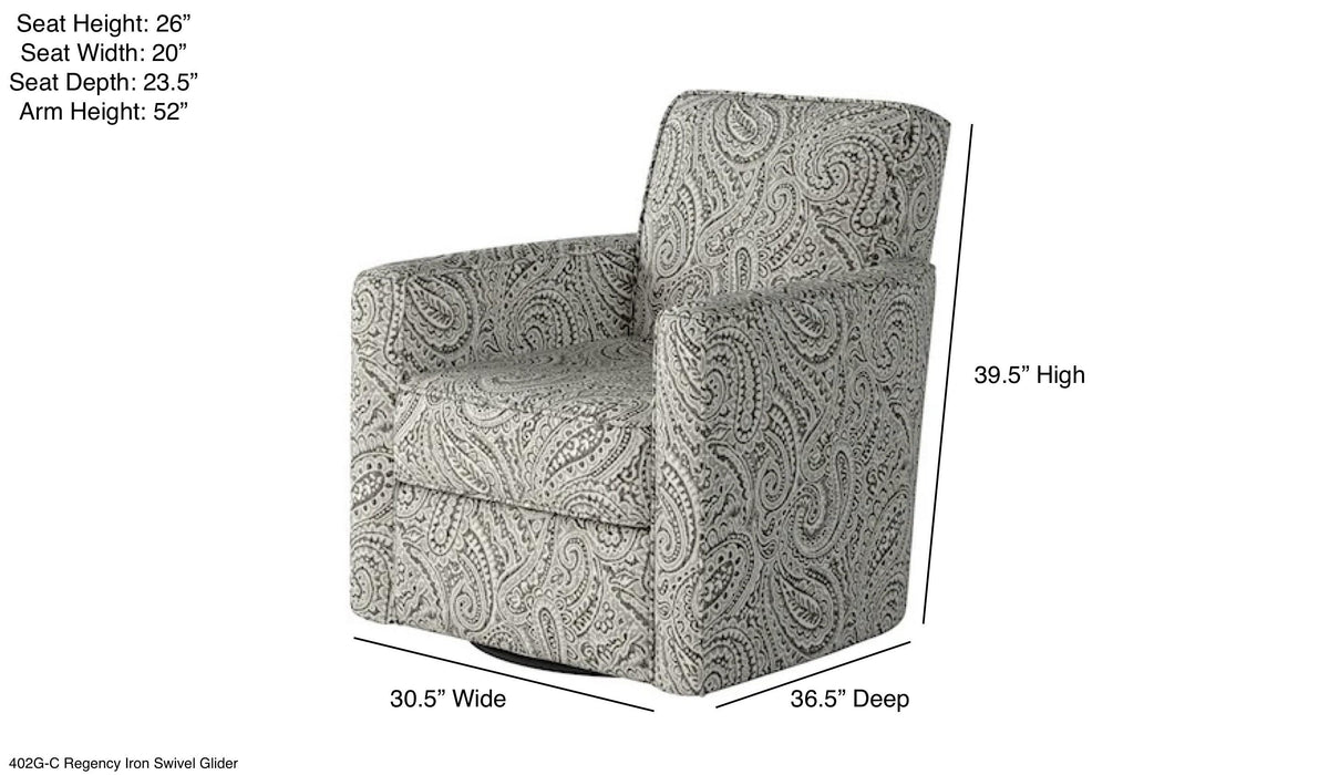 The Regency Iron Swivel Glider chair features a tight back, track arms with box border welt and a loose seat cushion. With the seat cushion being loose and reversible, it can be rotated to prolong the life of the material as well as the cushion core. It also allows for a more comfortable sit than a tight seat. This swivel glider chair is an attractive stand-alone chair, but also will go with most any transitional sofa or as a stand alone accent chair. The fabric is not only beautiful but also extremely durable. Looking for something with a little more range in motion? Our beautiful swivel gliders administer a 360 degree turn while also providing an easy rocking motion. Due to lighting and monitor differences, actual colors and finishes may vary slightly from what appears online